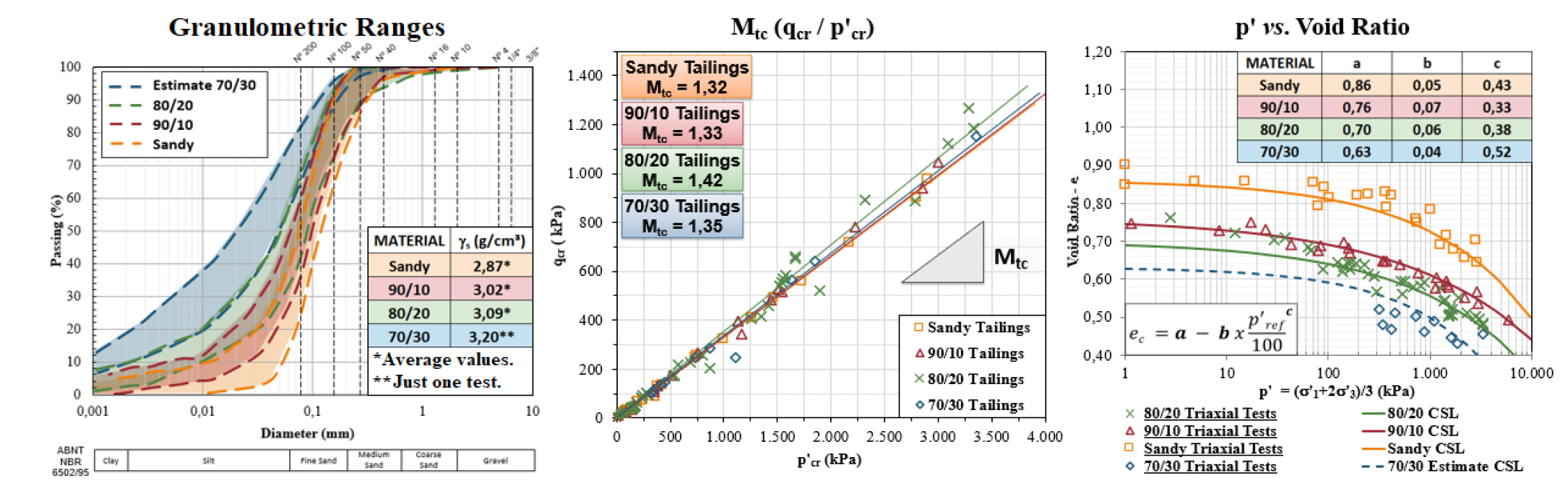 The tailings categories were defined according to granulometry, and typical values of γs, which lead to the definition of friction ratio (Mtc) and Critical State Lines (CSL), shown in Figure 1. The CSL equations were parametrized with the adjustment of the a, b and c coefficients (Verdugo, 1992).