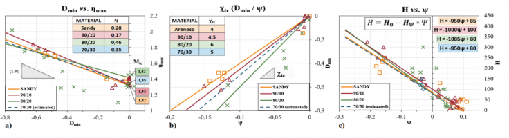 The results of parameter N are presented in Figure 3a. The volumetric coupling method values follow the order of magnitude observed in literature, and adequate to the value of M previously defined (Figure 1). For the 70/30 mixture, the median of typical values for sands was considered (0,35), as suggested by Jefferies & Been (2016), due to the lack of drained triaxial test results for this category.