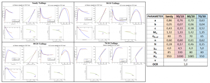 Based on the parameters presented in the previous sections, and considering the overconsolidation ratio (OCR) as 1, and Poisson coefficient (ν) as 0,2, it was possible to obtain a satisfactory calibration for the four tailings categories. The Norsand model adjusted to the tailings categories and the values of the calibrated parameters are presented in Figure 4.
