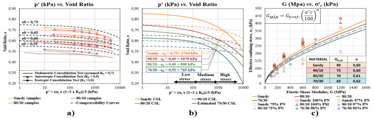Figure 2 (a) (b) Compressibility curves for the tailings categories and state parameter change indication; c) Elastic shear modulus (G0 and n)